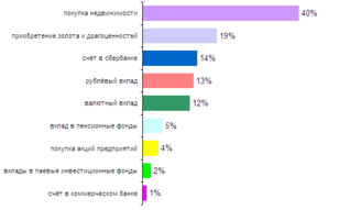 Так, несмотря на то, что популярность инвестирования в недвижимость с октября 2008 года с 51% снизилась до 40%, подобные вложения всё так же считаются выгодными и надежными среди сограждан. На втором месте по популярности оказалась покупка золота и драгоценностей (19%). Хранить деньги в банках, открывать рублёвые или валютные счета готовы около трети сограждан.