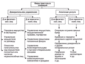 Трастовые операции. Трастовые операции — это операции коммерческих банков и специальных финансовых институтов, направленные на управление имуществом и осуществление других услуг по поручению клиента и в его интересах. В трастовых операциях фигурируют различные виды имущества клиентов.