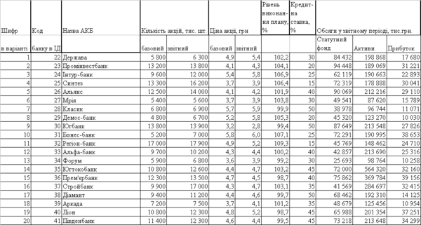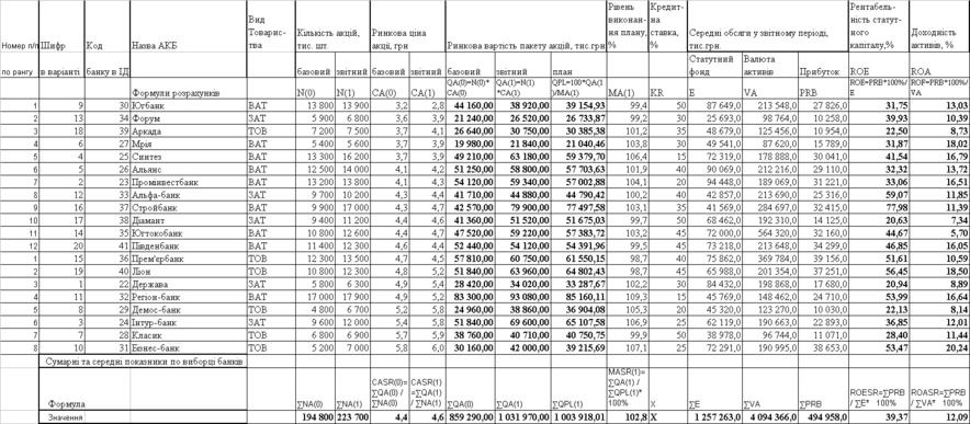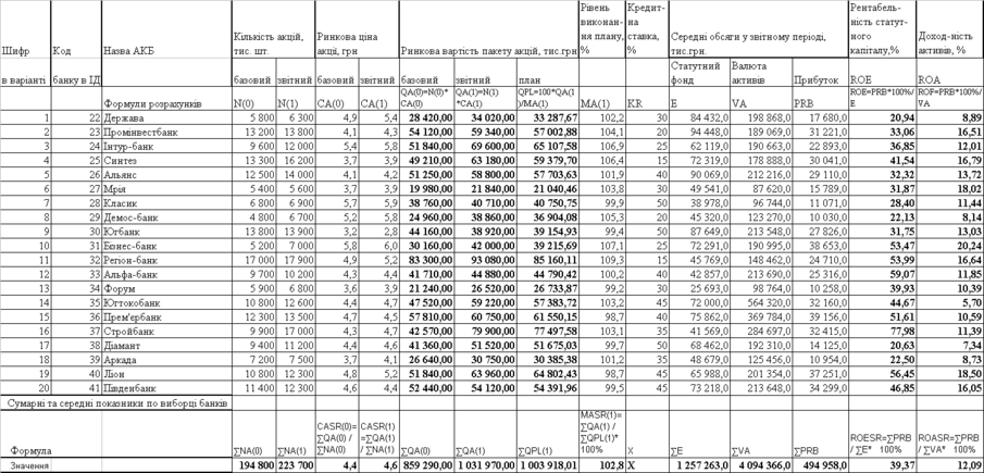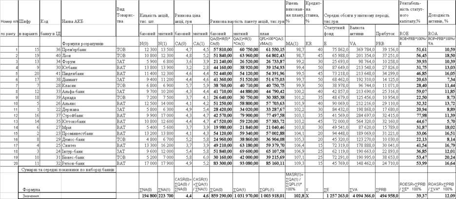 Згідно з вихідними даними, в табл.2.1 наведені результати статистичного спостереження показників діяльності 20 комерійних банків (з 22 по 41 згідно варіанту курсової роботи).