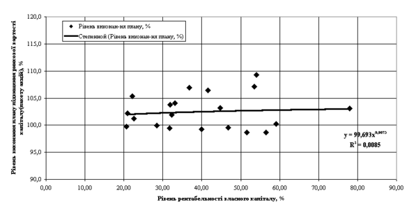 Як видно з аналізу даних табл.2.2 за звітний рік при прибутковій діяльності всіх банків виборки загальна ринкова ціна акціонерного капіталу (сума ринкових вартостей акцій) зросла( як за рахунок додаткових емісій акцій, так і за рахунок підвищення їх ринкової ціни), але не всі банки виконали запланований рівень підвищення ринкової ціни акціонерного капіталу.