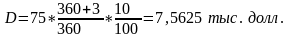 Форфейтор купил у клиента партию из 4-х векселей, каждый из которых имеет номинал 75 тыс. долл. Платеж по векселям производится 2 раза в год, т.е. через каждые 180 дней. При этом форфейтор предоставляет клиенту 3 льготных дня для расчета. Учетная ставка по векселям 10% годовых.