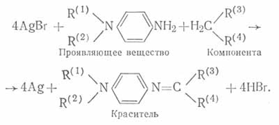 Получение элементарных изображений основано на так называемом цветном проявлении. В эмульсионные слои 2, 4 и 5 введены вещества - компоненты цветного проявления, которые, соединяясь с продуктом окисления проявляющего вещества, образуют красители - желтый, пурпурный и голубой. В качестве проявляющего вещества при цветном проявлении применяют производные парафенилендиамина, в котором атомы водорода одной из аминогрупп замещены радикалами R(1) и R(2), на природе которых мы остановимся позднее. Компоненты содержат так называемую активную * метиленовую Н2С= или метинную НС = группу.