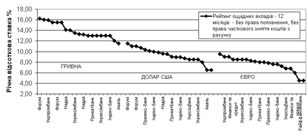 Рис.3.5. Рейтинг порівняльних відсоткових ставок накопичувальних строкових депозитів населення в АППБ „Аваль” та інших крупних банках-конкурентах банківської системи України (стан на 03.07.2006)