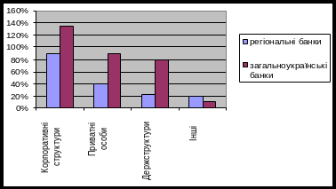Особливістю українських банків є спрямованість на одного або декількох крупних корпоративних клієнтів. Це найважливіша цільова аудиторія. Спрямованість на корпоративні структури більшою мірою простежується в регіональних, ніж у столичних банків (рис.3.7).