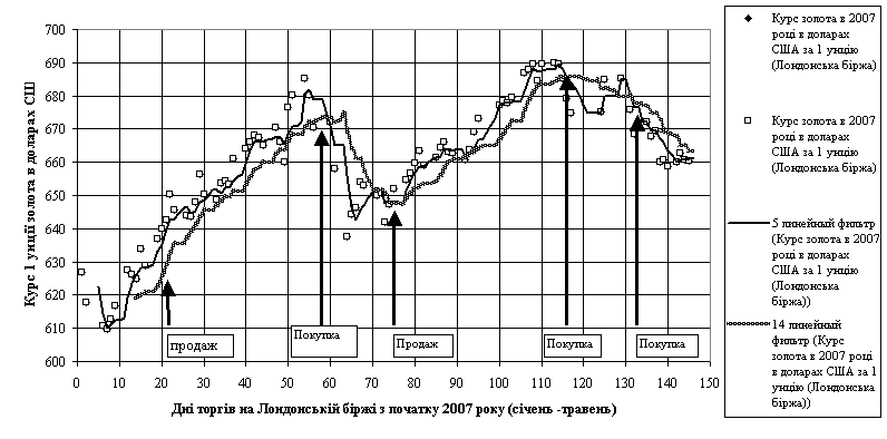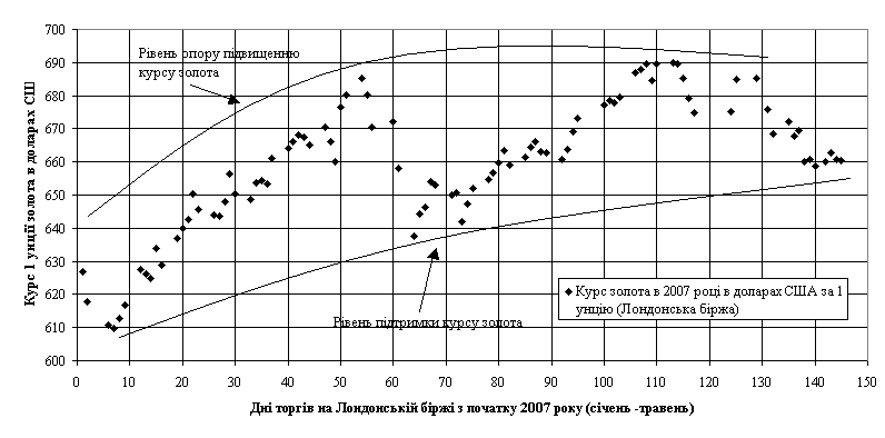 ис.Ж.3. – Технічний аналіз курсу золота по результатам торгів на Лондонській біржі у січні –травні 2007 року з