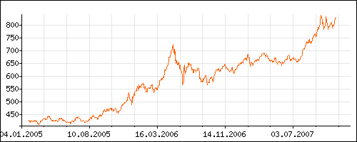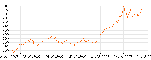 Рис.В.3. – Аналіз короткострокових тенденцій ринку золота у 2007 році (ціна унції золота в доларах США –