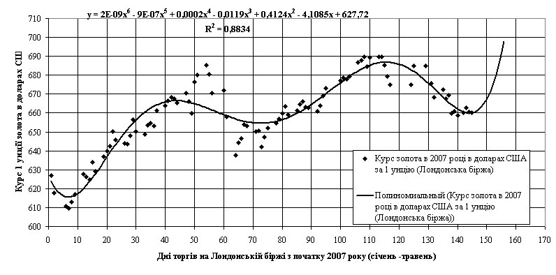 Рис.Ж.4. – Фактичний курс золота по результатам торгів на Лондонській біржі у січні – грудні 2007 року та оцінка короткострокового прогнозу з застосуванням метода поліноміальной регресії 6 ступеню з прогнозом на 10 днів вперед на початку травня 2007 року