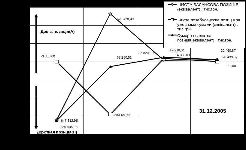 Рис.Д.3. Повалютний аналіз валютної позиції в АКБ «Приватбанк» станом на 31.12.2005 року