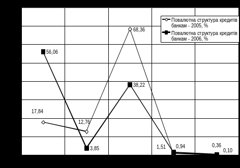 Рис.Д.7. Повалютний аналіз структури кредитів банкам та клієнтам