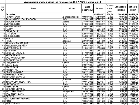 Рейтинг банків банківської системи України станом на 01.12.2007 року[77]