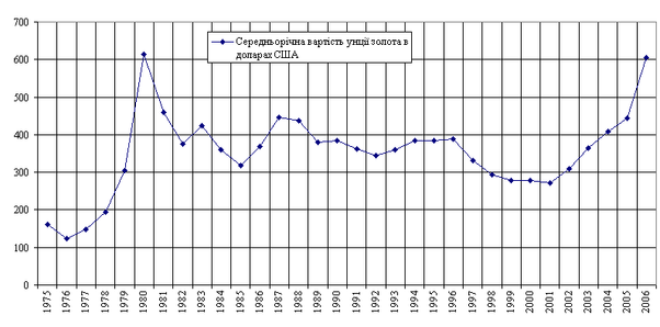 Рис.В.1. – Аналіз довгострокових тенденцій на ринку золота у 1975 – 2006 роках (середньорічна вартість унції