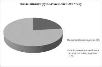 Анализируя число отозванных лицензий и общее число ликвидируемых банков в 2007 году можно придти к выводу, что на данный момент принудительная ликвидация кредитных организаций, обусловленная отзывом лицензии, преобладает над добровольной ликвидация банков по решению их руководителей (рисунок 2).
