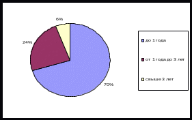 В кредитном портфеле преобладают краткосрочные кредиты, что показывает направленность финансирования АКБ «Московским Банком реконструкции и Развития» (ОАО) текущей деятельности своих клиентов. По состоянию на 01 января 2008 года доля кредитов, предоставленных на срок свыше 1 года, что составило только 30 % общего кредитного портфеля АКБ «МБРР» (ОАО). Основная часть кредитных ресурсов (70%) предоставляется клиентам банка на срок менее 1 года (рисунок 4.6).