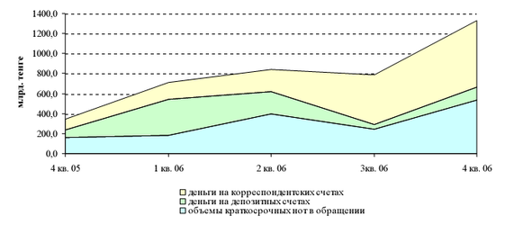 Применение инструментов денежно-кредитной политики позволило за 2006 год увеличить в 3,9 раза (с 345 млрд. тенге до 1330 млрд. тенге) объемы «связанной» ликвидности финансового рынка (объемы краткосрочных нот в обращении, деньги на депозитных и корреспондентских счетах банков в национальной и иностранной валютах) (рисунок 3).