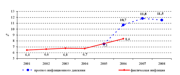 Этот результат согласуется с прогнозом потенциальной инфляции (без учета мер денежно-кредитной политики) инфляции на 2006 год, сделанный в конце 2005 года по модели Пи-Стар, прогноз по которой составлял 10,7% (рисунок 4) [4, с. 25].