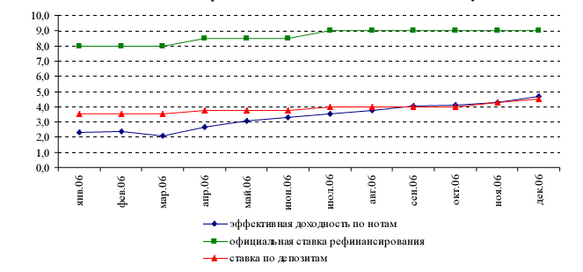 В рамках реализации первой группы мер с начала 2006 года официальная ставка рефинансирования была дважды повышена: с 1 апреля 2006 года с 8,0% до 8,5%, а с 1 июля 2006 года – до 9,0%. Ставка по привлекаемым от банков второго уровня депозитам была повышена 4 раза: с 1 апреля 2006 года с 3,5% до 3,75%, с 3 июля 2006 года – до 4,0%, с 1 ноября 2006 года – до 4,25%, с 1 декабря 2006 года – до 4,5%. Эффективная доходность по краткосрочным нотам повысилась за год с 2,24% до 4,69% (средневзвешенная доходность за месяц) (рисунок 2), а в январе 2007 года составила 4,91% [4, с. 22].