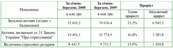 За 1 квартал 2009 року в порівнянні з 1 кварталом 2008 року зберігалася позитивна динаміка зростання активів страховиків (Таблиця 2.8), зокрема загальні активи страховиків зросли на 21,2%.