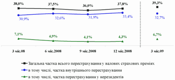 - частка перестраховиків-резидентів - 32,7% (у 1 кв.2008р. -30,9%).
