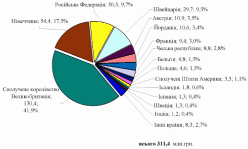 На (рис.2.5) представлено структуру перестрахування ризиків у нерезидентів за 1 квартал 2009 року. Від загальної суми сплачених часток страхових премій на перестрахування нерезидентам (311,4 млн.грн.), найбільше сплачено до Сполученого королівства Великобританії (41,% із сплаченого нерезидентам або 130,4 млн.грн.); Німеччини (17,5% або 54,4 млн.грн.) та Російської Федерації (9,7% або 31,3 млн.грн.).
