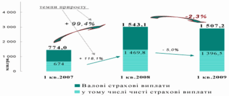 У порівнянні з аналогічним періодом 2008 року, обсяги валових та чистих страхових виплат у 1 кварталі 2009 року були значно меншими (рис.2.3). Так, темпи приросту валових страхових виплат у 1 кв.2009 знизилися на 2,3% порівняно до 1 кв.2008 року, а чистих до -5%.