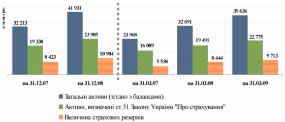- активів, які визначені статтею 31 Закону України „Про страхування”, 22,8 мільярдів гривень, що на 3,3 млрд.грн. перевищує показник станом на 31.03.2008.