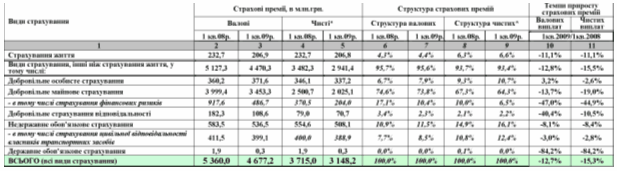 Страхові премії за видами страхування за 1 кв. 2008 р. та 1 кв. 2009 р. (обсяги, структура та темпи приросту)