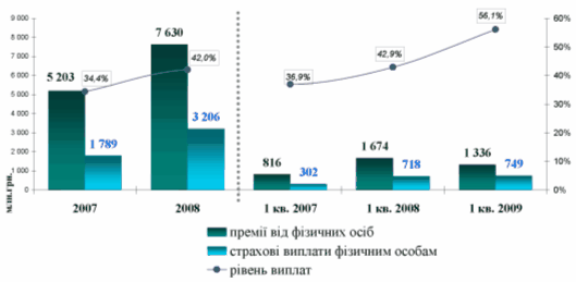 Рис.2.2 Страхування фізичних осіб (премії, виплати, та рівень виплат) у 2007-2008рр. та у 1 кв. 2007-2009рр.