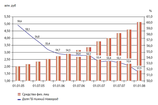 Рост вкладов населения составил 40% до 55 млн. рублей, потребительские кредиты составили 22 млн. рублей, кредиты предприятиям региона — 29 млн. рублей, увеличившись на 41%. Вклады населения в банках Нижегородской области в 2007 году выросли на 37% по сравнению с 2006 годом и составили 55 млн. рублей. Прирост вкладов населения в прошлом году составил 15 млн. рублей. 75% вкладов населения приходится на иногородние банки.