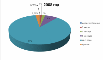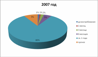 Из данных таблицы и диаграмм видно, что идет снижение остатков вкладов до востребования и краткосрочных вкладов (от 1 до 3 месяцев) идет тенденция к увеличению спроса населения на вклады со сроком свыше 1 года, что дает возможность банку увеличивать объем кредитов, выдаваемых на срок свыше 3 лет в своем кредитном портфеле.