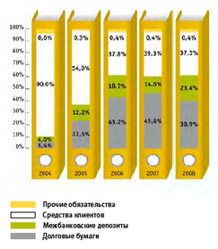 В структуре обязательств банка в 2008 году из существенных перераспределений было отмечено увеличение доли межбанковских депозитов на 8,8% за счет снижения доли средств клиентов и долговых бумаг — на 2,0% и 6,7% соответственно.