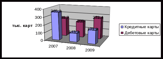Соотношение дебетовых и кредитных карт за период 2007 – 2009 гг. существенно изменилось (табл. 2.12 и на рис. 2.14). Если в 2007 году основную долю составляли кредитные карты, то в 2008-2009 гг. упор сместился на дебетовые.