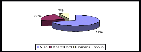 Соотношения по типам платежных систем в 2009 году составили: 71% Visa; 22% - MasterCard; 7% - «Золотая Корона» в 2009 году представлено на рис. 2.13.