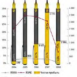 В 2007 год наблюдалось стабильное увеличение по всем группам ключевых показателей, однако в 2008 – все показатели, кроме показателя «Отношение административных расходов к операционной прибыли» (рост на 4,6%), показали отрицательную динамику.