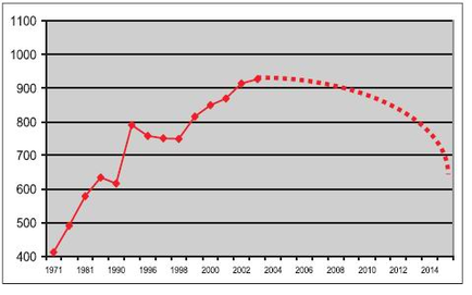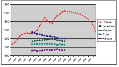 Целевая направленность всех мероприятий на преодоление к 2010 г. отрицательной динамики здоровья населения РФ и достижения к 2015 г. показателей здоровья, сопоставимых с уровнем стран Восточной Европы. Для этого необходимо разработать погодовые графики достижения этих целей (рис. 2. 13,2.14). Научная обоснованность принимаемых решений [в странах ЕС при министерствах здравоохранения или аппарате правительства для этих целей специально создаются специальные комитеты (Health Рис. 2.13 Смертность населения РФ; скорость снижения параметра примерно 3% в год Рис. 2.14 Смертность населения РФ от болезней системы кровообращения; скорость снижения параметра примерно 3% в год Ежемесячный мониторинг по количественно измеряемым показателям (индикаторам), поскольку все мероприятия программы следует оценивать не только по объемным показателям, но и по качественным. Например, в рамках проекта «Здоровье» увеличено число больных, которым доступны высокотехнологичные виды медицинской помощи, с 60 тыс. в 2004 г. до 128 тыс. в 2006 г. и до 170 тыс. в 2007 г. При этом неясно, достаточно ли такого увеличения для существенного снижения смертности трудоспособного населения, например от сердечнососудистых заболеваний. Мотивация не отдельных категорий врачей, а всех работников здравоохранения на достижение качественного результата. Публичность полученных результатов, управление взаимодействием других министерств и ведомств и всего населения. Необходимо скорректировать ряд позиций по проекту «Здоровье», в первую очередь дополнить список медицинских работников, которым будет повышена заработная плата, с включением в него всех врачей, оказывающих первичную медико-санитарную помощь, а именно врачей скорой помощи, акушеров-гинекологов, узких специалистов, а также медицинского персонала фельдшерско-акушерского пунктов (ФАП) и др. (Для справки: повышение оплаты труда всем врачам на 10 тыс. руб. обойдется бюджету в 90 млрд. руб., включая единый социальный налог, что составит 0,37% ВВП). Повышение заработной платы на 5 тыс. рублей среднему медицинскому персоналу обойдется бюджету еще в 113 млрд. руб., включая ЕСН. Кроме того, необходимо выстроить управление программой «Здоровье» в соответствии с современными принципами проектного управления. Преодоление отрицательной динамики здоровья населения России и достижение показателей здоровья, соответствующих развитому государству – являются общенациональной задачей. В течение последних нескольких лет предложения о реформировании ОМС высказывались неоднократно. Их можно свести к трем основным вариантам: 1) объединение ОМС и страхования на случай болезни, материнства и смерти и переход к медико-социальному страхованию; 2) переход к условно-обязательному медицинскому страхованию экономически активного населения; 3) переход к условно-обязательному медицинскому страхованию неработающего населения. Это позволит за период до 2015 г. сохранить 4 млн. жизней наших сограждан. Страховые взносы субъекта Российской Федерации на ОМС неработающего населения должны устанавливаться в размере не меньшем, чем размер, обеспечивающий сбалансированность суммы средств из всех источников, предназначенных для финансирования базовой программы ОМС, и ее стоимости. Стоимость базовой программы ОМС в субъекте Российской Федерации должна определяться 