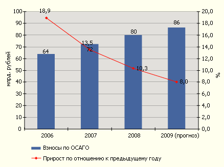 По предварительным данным рейтингового агентства «Эксперт РА», объем рынка автокаско за 2008 год составил 176 млрд. руб., увеличившись по сравнению с 2007 годом на 15%. Реальные проблемы впереди: по прогнозу агентства, за текущий год российские страховщики соберут взносов на 25% меньше, чем за год предыдущий (без учета инфляции). Анализ рынка ОСАГО представлен на рисунке 8.