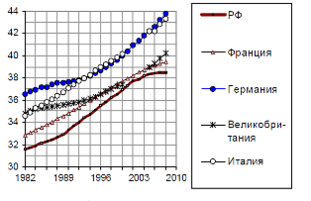 Население государства считается старым, если в его структуре доля людей в возрасте от 65 лет и старше превышает 7%. В России этот показатель равняется 12%. На одного пенсионера приходится всего 1,7 работающих. Население страны стареет, за период 1989 – 2007 гг. средний возраст россиянина вырос на 4,5 года, до 38,5 лет (рис. 1.1).