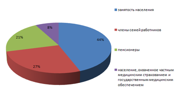 Общие расходы на здравоохранение в 2005 году составили 11,1% ВВП, или 3001 долл. США на душу населения. Структура застрахованных по ОМС представлена на рис. 1.3.