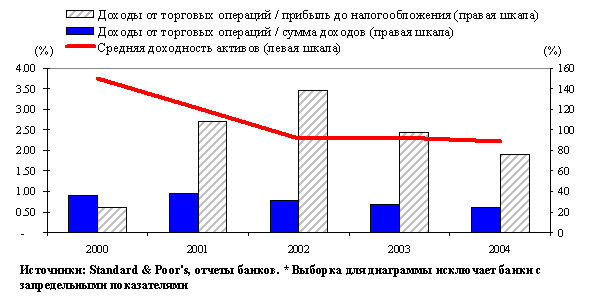 По данным табл. 17 можно сказать, что наиболее эффективными игроками являются банки, давно зарекомендовавшие себя на финансовых рынках, особенно в работе с валютными бумагами. У Еврофинанса, КИТ Финанс банка, НРБанка, Внешторгбанка, ДиБа, Никойла - существенная доля ценных бумаг в активах, и доля доходов от бумаг в их прибыли также высока - не менее 30%. Кроме них, в списке лидеров присутствуют три дочерние структуры иностранных банков, которые обычно активны на «местном» финансовом рынке.