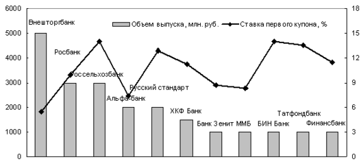 На текущий момент в обращении находятся рублевые облигации российских банков на сумму более 70 млрд. руб., векселя – более, чем на 560 млрд. руб. Количество кредитных организаций-эмитентов облигаций составляет 33, векселей — более 900. В общем списке наравне с крупными известными эмитентами присутствуют также банки «второго круга», в том числе и региональные. На первую десятку крупнейших эмитентов приходится около 80% всего объема находящихся в обращении облигаций банков РФ в национальной валюте. У остальных банков средний размер выпуска незначительно превышает 470 млн. рублей (рис.9).