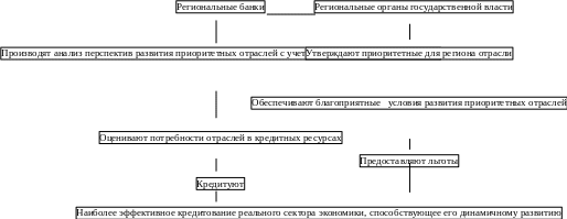 Региональные органы государственной власти (Законодательное Собрание, которое утверждает бюджет субъекта РФ, администрация губернатора/правительство, которое разрабатывает Стратегии развития субъекта) определяют основные приоритетные для каждого конкретного региона отрасли (в соответствии со спецификой каждого региона). Региональные банки кредитуют эти приоритетные отрасли. Причем, региональные власти гарантируют банкам, что эти отрасли будут развиваться с учетом их поддержки.