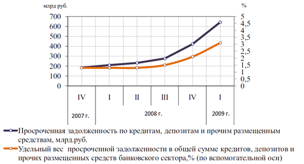 По данным Центрального банка РФ, просроченная задолженность по кредитам, депозитам и прочим размещенным средствам выросла более чем в два раза, и увеличилась по состоянию на 1 июля 2009 г. на 97 % по сравнению с данными 2008 года. Это наглядно отражает рисунок 2.1. Причем стремительный рост объемов просроченной задолженности демонстрирует 4 квартал 2008 года. Удельный вес ее в этот период возрос с 1,5% в начале периода до 3% в конце, и составила 700 млрд. руб. Такая ситуация возникла по причине возникновения мирового финансового кризиса, который прежде всего оказал негативное влияние на банковский сектор. Дело в том, что из-за паники на фоне мирового финансового кризиса, в стране стал наблюдаться дефицит денежной массы, в частности наличности. Предприятия и организации стали на себе ощущать нехватку денег на покрытие текущих расходов. В период с декабря 2008 – по март 2009 года прекратилось финансирование крупных инвестиционных проектов, многие из них были законсервированы на неопределенный срок, предприятия и организации стали пересматривать свои стратегические планы, оказываться от реализации различных программ. К тому же образовалась просрочка по текущим обязательствам (перед персоналом, банками, поставщиками).