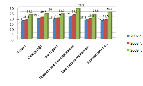 Самое резкое удорожание наблюдается по краткосрочному кредитованию. Рост ставок по данному виду в 2009 году по сравнению с 2008 составил 38%. В целом этот вид кредитования наиболее популярный, поэтому банки исходя из собственных интересов поднимали ставки в докризисное время. Рост ставок в докризисное время в среднем составлял 12-13%. Самым дешевым кредитом на протяжении всего анализируемого периода оставался лизинг, но в 2009 году он подорожал на 27%. Самым дорогим видом кредитования является проектное финансирование.