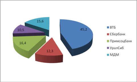 Наибольшую долю в структуре рынка занимает ВТБ. Он забрал себе половину всех корпоративных клиентов. На втором месте Сбербанк, который в основном специализируется на потребительском кредитовании. ПримСоцБанк занимает третье место и его доля по сравнению с остальными банками достаточно мала.