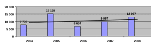 В течение периода с 01.01.04 г. по 01.01.08 г. динамика полученной прибыли анализируемого банка имеет непостоянную динамику, что характеризует деятельность банка как неустойчивую. Например, на 01.01.04 г. прибыль составила 7 739 тыс. руб.; на 01.01.05 г. - 15139 тыс. руб.; на 01.01.06 г. – 6 334 тыс. руб.; на 01.01.07 г. – 9 997 тыс. руб.; на 01.07.07 г. – 9 332 тыс. руб.; на 01.10.08г. – 12 967 тыс. руб.