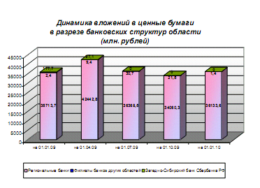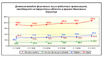 Средства организаций на расчетных и прочих счетах за 2009 год снизились на 5,9% и составили 67,8 млрд. рублей. За 2009 год общий объем кредитов, депозитов и прочих размещенных банками области средств снизился на 7,9%, с 362,3 до 333,9 млрд. рублей, как за счет снижения кредитных вложений нефинансового сектора на 6,9% со 181,7 млрд. рублей до 169,2 млрд. рублей, так и физических лиц на 11,5% со 157,2 млрд. рублей до 139,1 млрд. рублей. Для сравнения, за 2008 год по данным показателям отмечался рост: объем кредитов, депозитов и прочих размещенных увеличился на 23,5%», кредитные вложения нефинансового сектора возросли на 28,8%, кредиты физических лиц выросли на 26,0%.