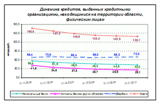 Значительная часть этих кредитов, свыше 62,0%, предоставлена филиалами банков других регионов, около 38,0% – региональными банками. Удельный вес просроченной задолженности в общей сумме кредитных вложений нефинансовым организациям увеличился за год на 3,7 процентных пункта и на 01.01.2010 г. составил 5,0% или 8,5 млрд. рублей. Задолженность населения по кредитам за 2009 год снизилась на 11,5% со 157,2 до 139,1 млрд. рублей. Причем, снижение кредитования наблюдается по всем банковским структурам области: филиалам банков других регионов – 9,2 млрд. рублей, региональным банкам – 8,8 млрд. рублей.