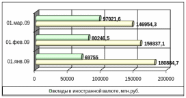Из таблицы 2.4 видно, что удельный вес вкладов в иностранной валюте увеличился к концу 2008 года на 5,2% и составил на 01.01.2009г. 69755,0 млн. рублей. Удельный вес вкладов в белорусских рублях наоборот снизился за этот же период с 77,4% до 72,2% по состоянию на 01.01.2009г. Приведенные факты показывают, что объем привлеченных депозитов в иностранной валюте за 2008г. в 2,6 раза превышают объемы привлечения в белорусских рублях. Однако, в целом, удельный вес вкладов в белорусских рублях по состоянию на 01.01.2009 года в общей совокупности составляет 72,2%, что на 44,4% больше, чем у вкладов в иностранной валюте. Это означает, что граждане Беларуси по-прежнему отдают предпочтение хранению сбережений в национальной валюте. А это в свою очередь говорит о доверии населения к белорусскому рублю. На сегодняшний день в условиях мирового финансового кризиса в банковской системе Беларуси не было тотального оттока денежных средств с вкладов. Происходит не столько изъятие денег с вкладов, сколько смена валюты, население переводит рублевые депозиты в валютные. Данная тенденция характерна для всего банковского сектора страны и связана с неустойчивым экономическим развитием республики в отчетный период, увеличением инфляционных ожиданий населения. Сегодня, в условиях нестабильности мировых финансовых рынков, беспокойства населения о судьбе своих сбережений сберегательная активность населения снижена. В такой ситуации больше расходую ранее накопленные сбережения, усиливается тезаврация денежных средств, то есть растет объем так называемых матрацных денег.