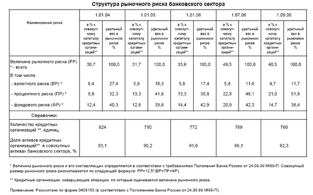Очевидно, что доля рыночного риска в проценте к совокупному капиталу кредитных организаций увеличилась в 2006 году по сравнению с предыдущими отчетными периодами. Также можно говорить об увеличении удельного веса процентного риска в рыночном риске.