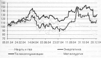 Несмотря на то, что в 2004 году рост цен на российском рынке акций продолжился, темпы прироста цен оказались существенно меньшими, чем в предыдущие три года, и ниже, чем уровень инфляции. Если же посмотреть на отраслевые индексы, то можно увидеть, что в разное время инвесторами отдавалось предпочтение разным отраслям, и здесь можно выделить отрасли-лидеры и отрасли-аутсайдеры (см. рис. 2).