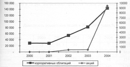 Объем размещения акций на внутренних рынках с привлечением нового капитала вырос в 2004 году более чем в 20 раз по сравнению с 2003 годом. Сравнение динамики размещения акций и корпоративных облигаций на внутреннем рынке страны характеризуют данные рис. 1.
